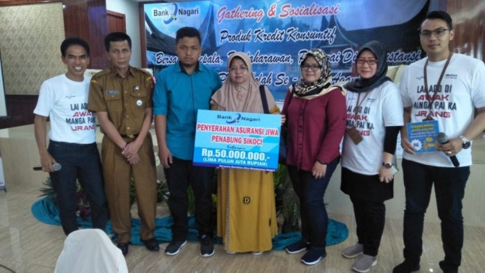 Penyerahan asuransi berupa uang tunai Rp50 juta itu, dilakukan dalam acara Gathering dan Sosialisasi Produk Bank, Selasa (25/6/2019), di Hotel Sakura Syariah Lubuk Basung.