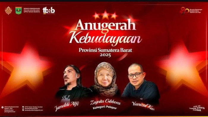 Padang, sumbarsatu.com — Malam ini, Rabu (1/10/2025), Auditorium Gubernur Sumatera Barat dilangsungkan pemberian Anugerah Kebudayaan Sumatera Barat 2025. Tiga nama ini diumumkan sebagai penerima penghargaan: Yusrizal KW, Jumaldi Alfi, dan Zeynita Gibbons. Mereka adalah para pelopor yang kiprahnya melintasi batas, dari ruang baca, literasi, kanvas seni, hingga diplomasi budaya.