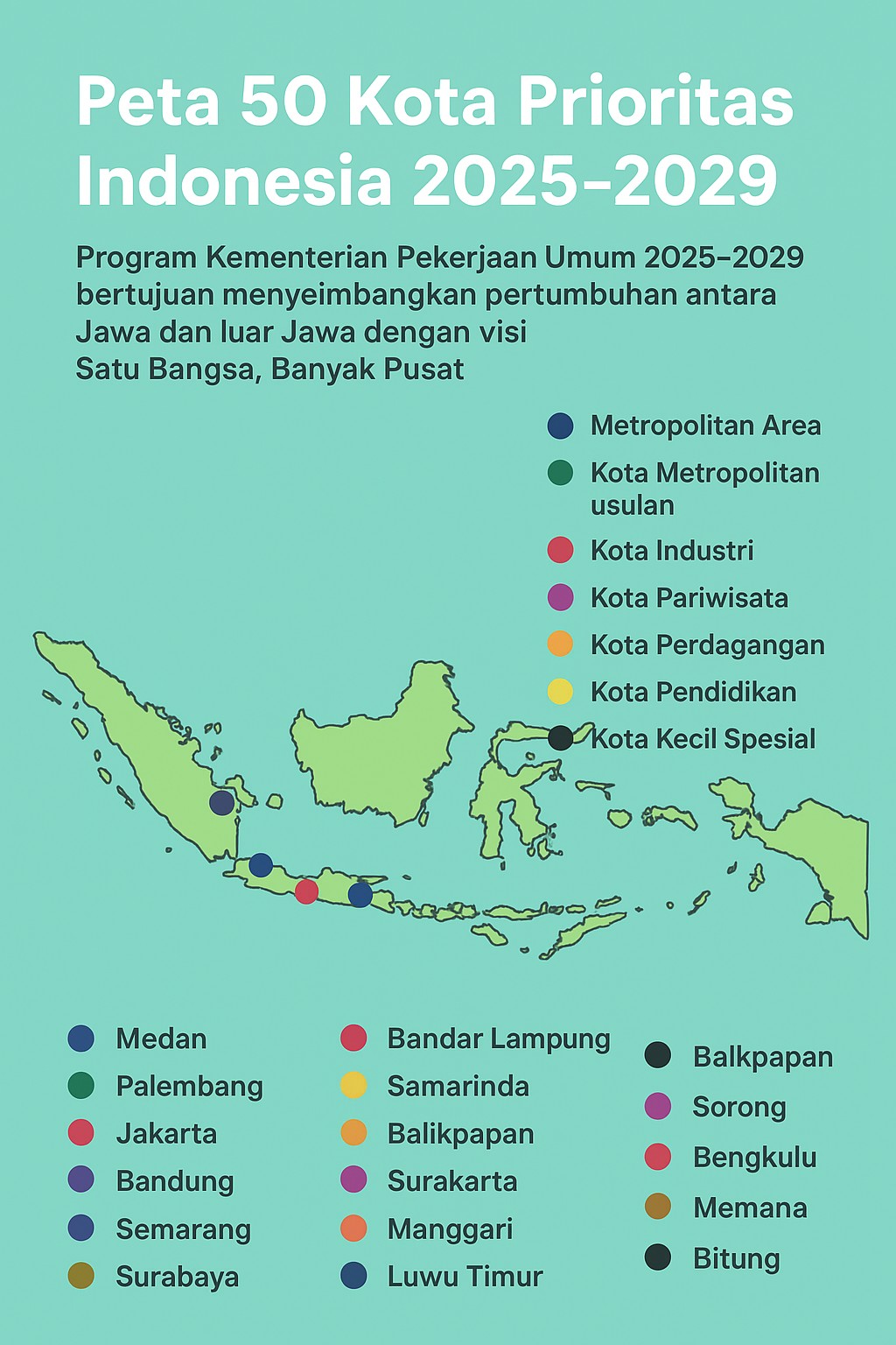 Jakarta, sumbarsatu.com — Pemerintah Indonesia menyiapkan langkah strategis dalam menata pertumbuhan wilayah nasional melalui rancangan 50 kota prioritas untuk periode pembangunan 2025–2029.