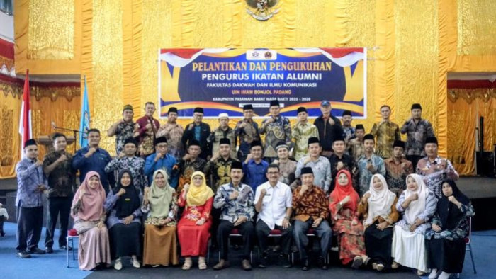Pengukuhan tersebut, dihadiri oleh Asisten III Setda Pasaman Barat Raf’an, Ketua Pengurus Alumni FDIK UIN IB Padang Pusat AKBP (Purn) Drs. H. Aswir Nasution, M.Pd., serta Dekan Fakultas Dakwah dan Ilmu Komunikasi Dr. Murisal, M.Pd. Adapun Ketua Alumni Pasaman Barat yang terpilih adalah Ipda Eddisal, S.Sos.I., M.Si., yang juga menjabat sebagai Kasi Keuangan Polres Pasaman Barat.
