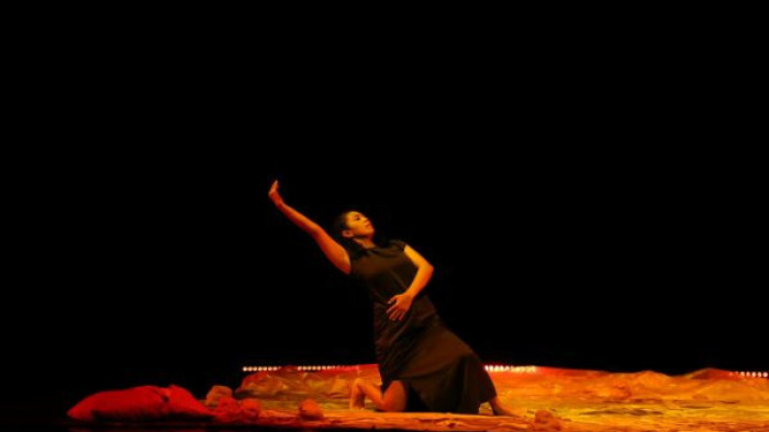 Melalui Tubuh Ibu, Sungai yang Bergeser, koreografer Siska Aprisia menegaskan tubuh perempuan sebagai sungai ingatan—mengalir, menggerus, dan sekaligus melahirkan perubahan. Ia sendiri di panggung yang cukup luas itu membangun arsitektur tarinya.