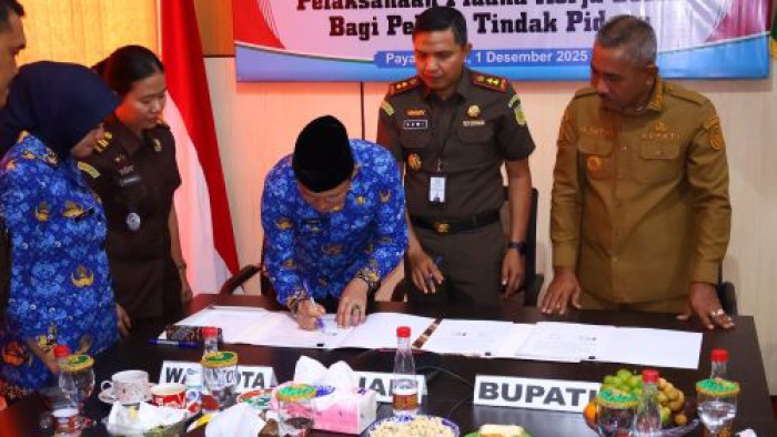 Penandatanganan ini merupakan bagian dari kegiatan serentak se-Provinsi Sumatera Barat yang dipimpin Gubernur Mahyeldi Ansharullah dan Kepala Kejaksaan Tinggi Sumbar, Muhibuddin, serta diikuti kabupaten/kota secara virtual.