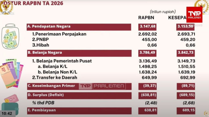 Sementara itu, belanja negara ditetapkan sebesar Rp 3.842 triliun, yang dialokasikan untuk belanja pemerintah pusat dan transfer ke daerah (TKD). Dengan struktur tersebut, APBN 2026 mencatat defisit anggaran sebesar Rp 689,14 triliun.