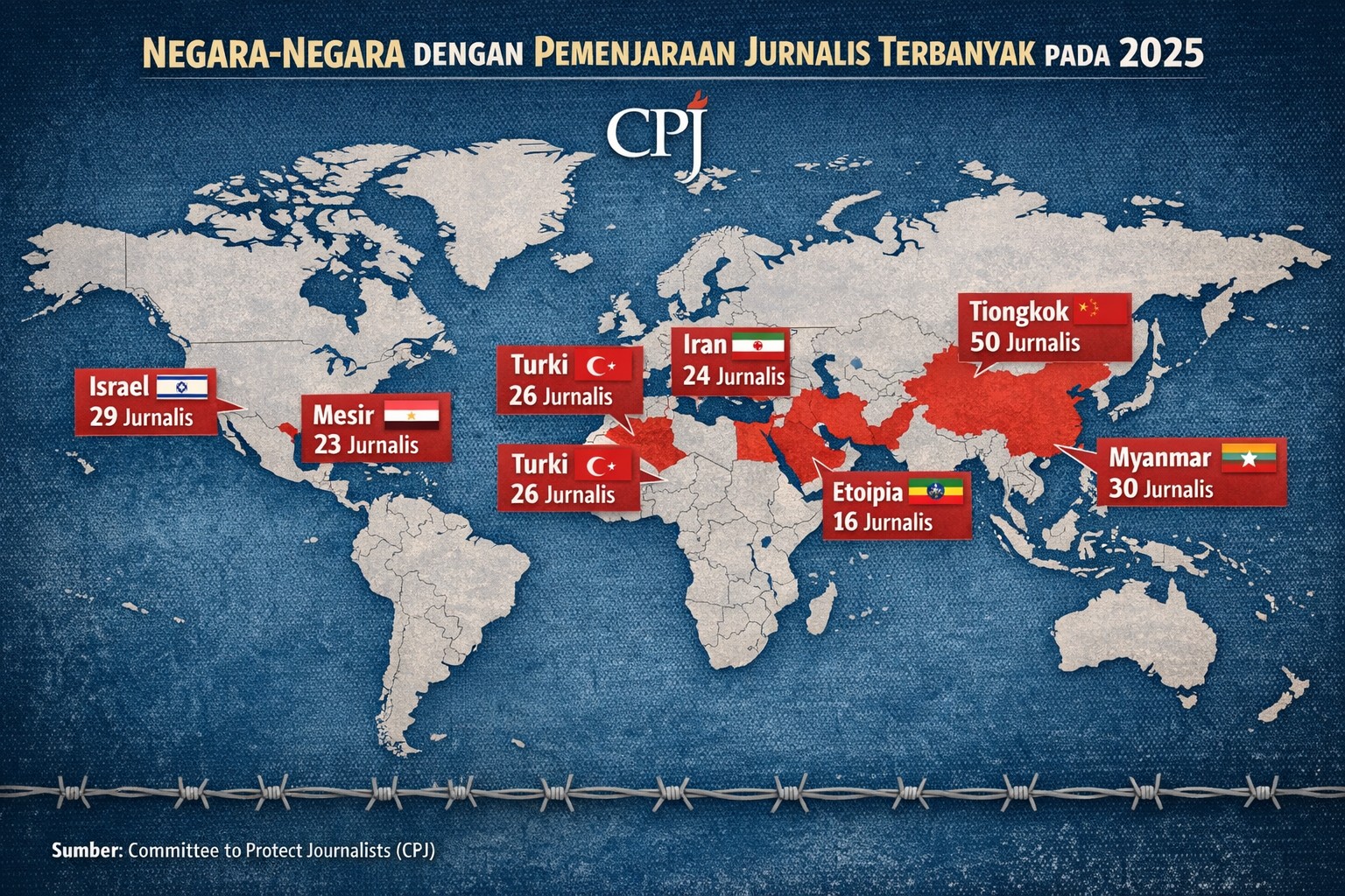 New York, sumbarsatu.com—Pemenjaraan jurnalis di seluruh dunia masih berada di tingkat yang mendekati rekor tertinggi, terutama dipicu oleh represi politik di tengah maraknya korupsi dan penyalahgunaan kekuasaan. Sedikitnya 330 jurnalis masih dipenjara di berbagai negara pada 2025, didorong oleh “meningkatnya otoritarianisme dan eskalasi konflik bersenjata.”