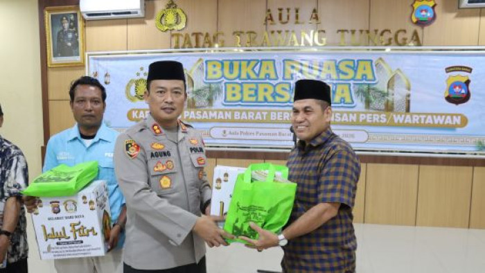 Setelah melaksanakan acara buka puasa bersama, Kapolres Pasaman Barat AKBP Agung Tribawanto menyerahkan bingkisan lebaran kepada puluhan wartawan sebagai bentuk tali asih menjelang Hari Raya Idulfitri 1 Syawal 1447 Hijiriah.
